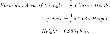 Step 3: Calculate Perpendicular Distance Measure the base line GD, which in this case is 203 links or 2.03 chains. To find the required perpendicular height for a triangle with area 1 square chain and base 2.03 chains, divide 1 by half the base length (1.015 chains). The result is 0.985 chains (98.5 links), representing the perpendicular distance from line GD needed to create the additional triangular area.