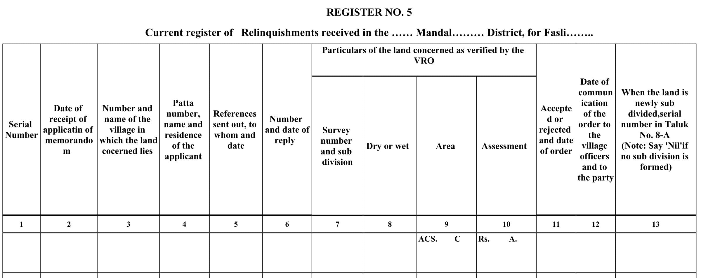 - It is also maintained for a Fasli year. An alphabetical index list of villages should be prefixed to this Register.